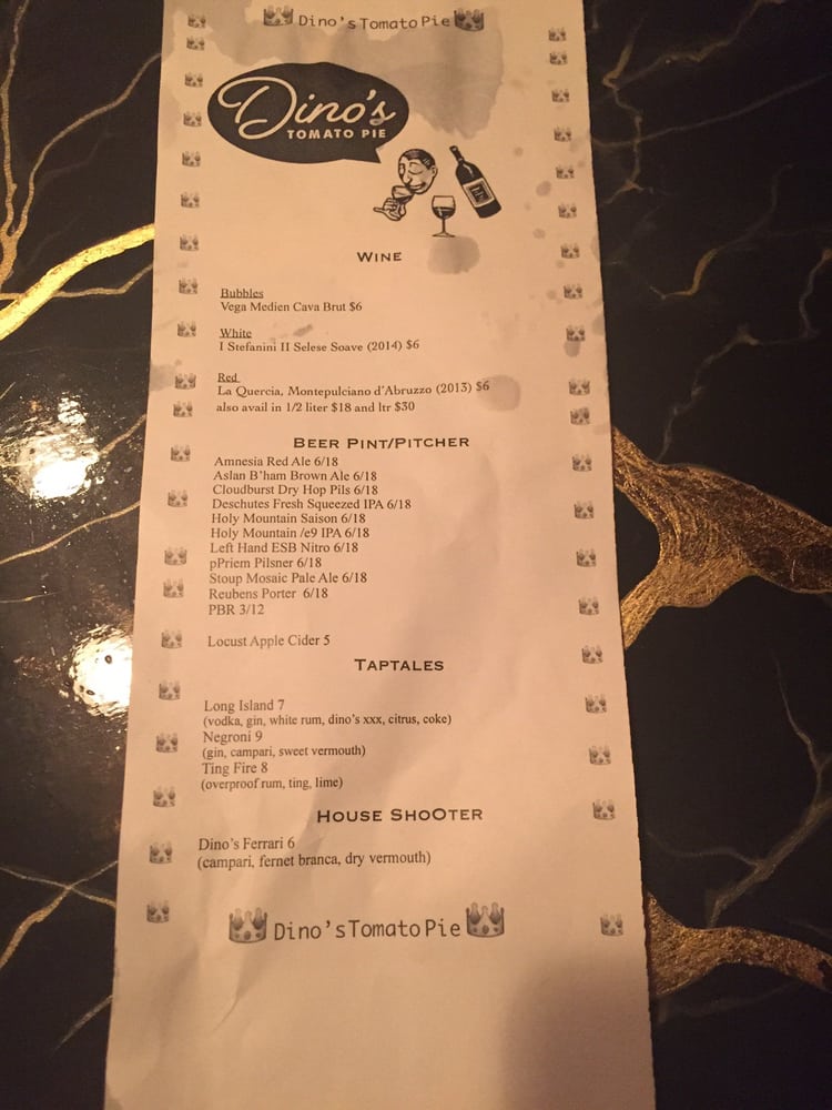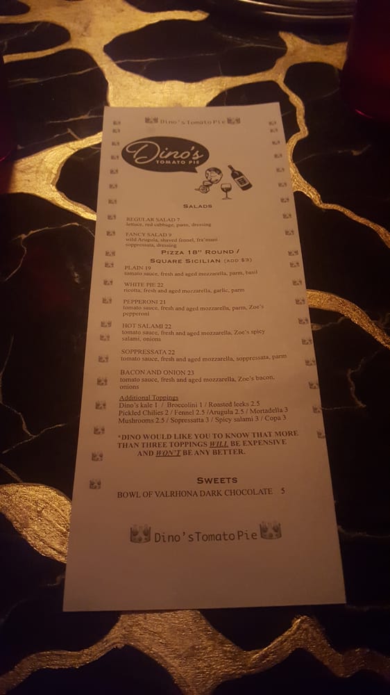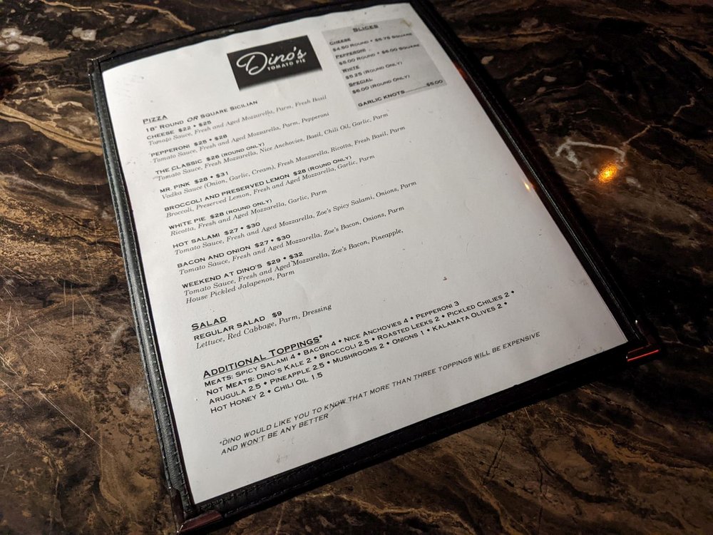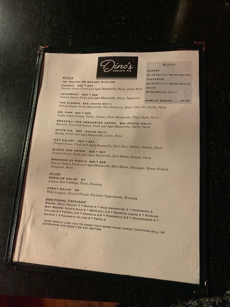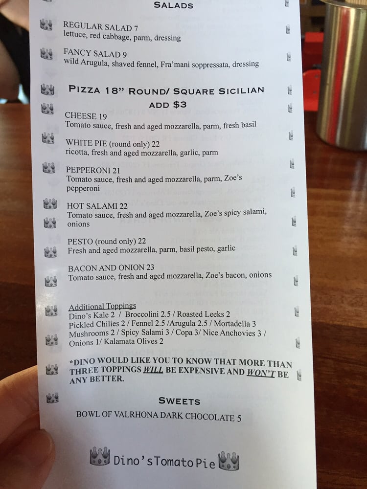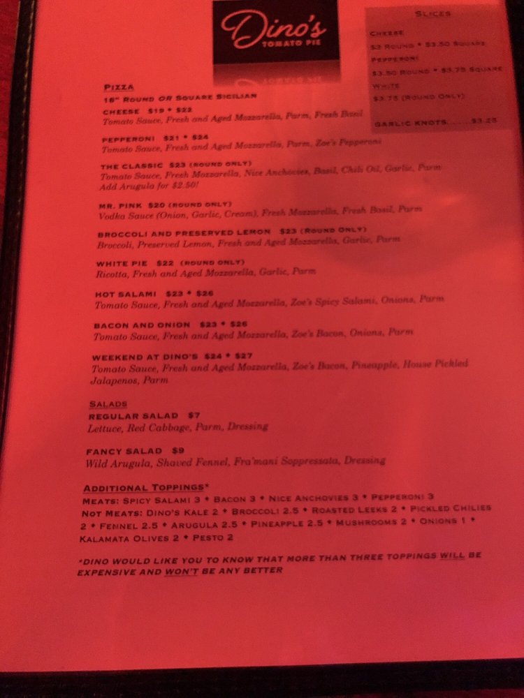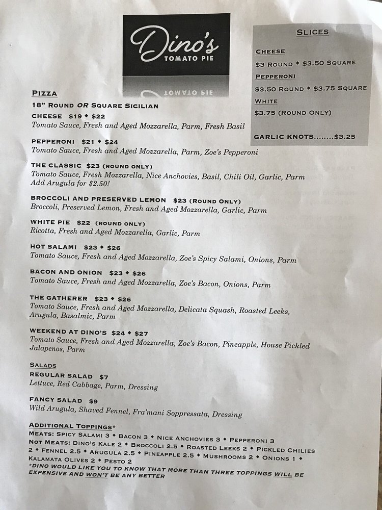 basil pesto, fresh and aged Mozzarella, Parm Dino would like you to know that more than three toppings will be expensive and won't be any better.