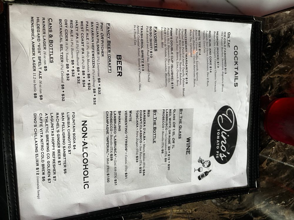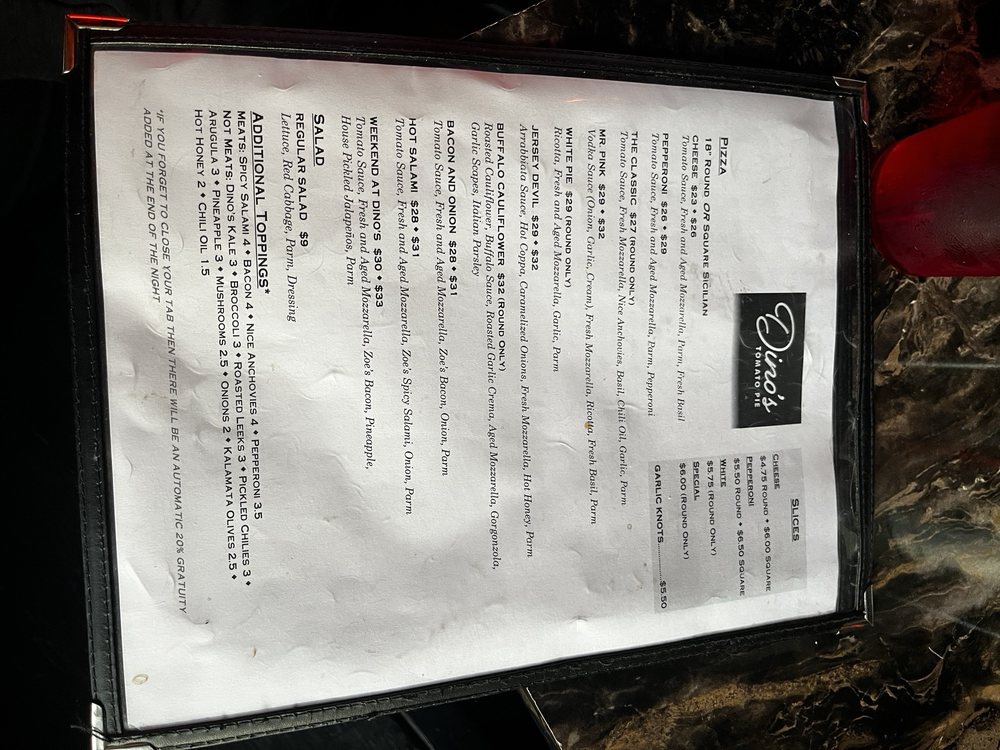 Tomato sauce, fresh and aged Mozzarella, Parm, basil. Dino would like you to know that more than three toppings will be expensive and won't be any better.