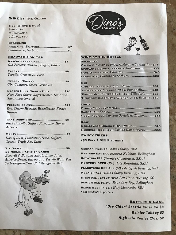 Dino's Tomato Pie is a trendy cocktail bar in Seattle offering a diverse menu with a focus on pizza. With options for delivery, takeout, and reservations, it caters to various dining preferences. The restaurant provides a hipster, casual atmosphere with ample vegetarian choices and accepts various payment methods, including cryptocurrency. Dino's boasts a full bar, happy hour specials, and outdoor seating, making it ideal for group gatherings or late-night outings. The menu features unique pizza toppings like bacon & onion and pepperoni, along with delicious salads. The establishment also offers amenities such as Wi-Fi, smoking and dogs allowed, and a pool table for entertainment. Overall, Dino's Tomato Pie provides a lively dining experience with a diverse selection of food and drinks to enjoy.